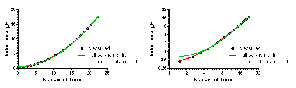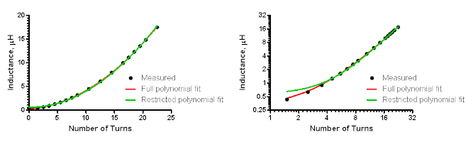 but it is not justified by Physics. The relative discrepancy between measured data and model is largest at the low-inductance end. A double logarithmic plot (Figure 9, right) reveals more clearly that the reported inductance in the low-inductance range becomes asymptotically horizontal. The explanation, which can be supported experimentally, is that the leads and contacts contribute to the inductance by adding a constant offset. The experimental support comes from using varying lengths of lead wires and from twisting the lead wires: The wires seen in Figure 5 contribute approximately 200nH untwisted and less than 50nH twisted.