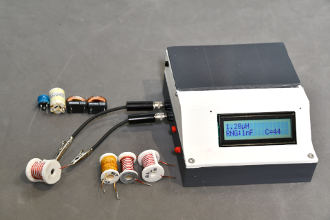 Calibration: Roughly 25 fixed inductors in the value range from 1μH to 100μH with nominal inductance were collected (some of them are displayed in Figure 8). The inductance was measured with this device and compared to the nominal inductance, whose tolerances were assumed to have a zero mean. The calibration constant \( a = \left( ( 2 \pi)^2 (C + C_0) \right)^{-1} \) and the wire inductance \( L_0 \) were obtained by nonlinear regression. The new constants were programmed into the software to convert frequency to reported inductance.