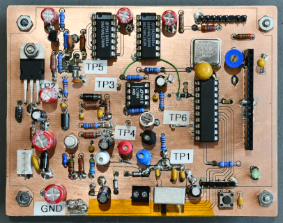 The complete assembled board is shown in Figure 5. The layout mistakes above are visible: Near TP1, a hand-routed trace is visible. A green jumper wire carries the correct amplitude signal to the microcontroller. Note the small SOT-89 comparator left of TP5. Also note that for easier identification the oscillator transistors were color-coded with colored shrink tube (1 - red; Q2 - blue; Q3 - black; Q4 - white; no shrink tube for Q5).