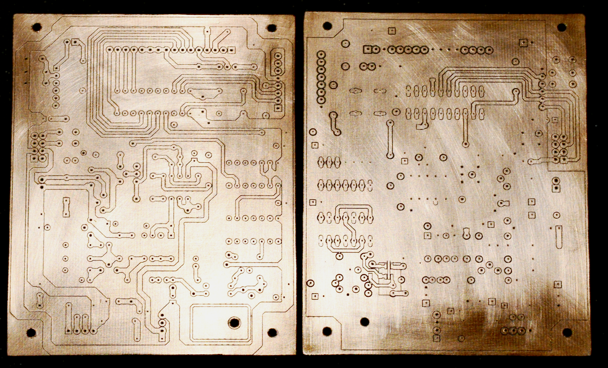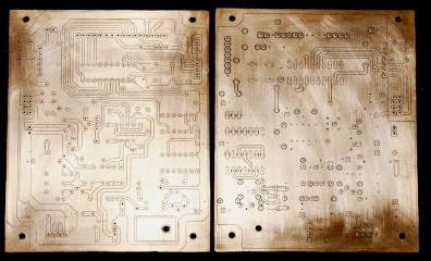 Incorrect interpretation of the Gerber files: The PCB mill interpreted some of the larger polygonal regions incorrectly. For example, the trace that connects TP1, the base of Q1 and the collector of Q2, was not cut out of the ground plane. Some less significant mistakes that the PCB mill software made included notably some of the IC ground and supply connections. These mistakes were remedied with an x-acto knife. The PCB layout had only one real design mistake -- the AGC level input to of the microcontroller was connected to the wrong op-amp output; this mistake is corrected in the PCB and Gerber files that can be downloaded from this page.