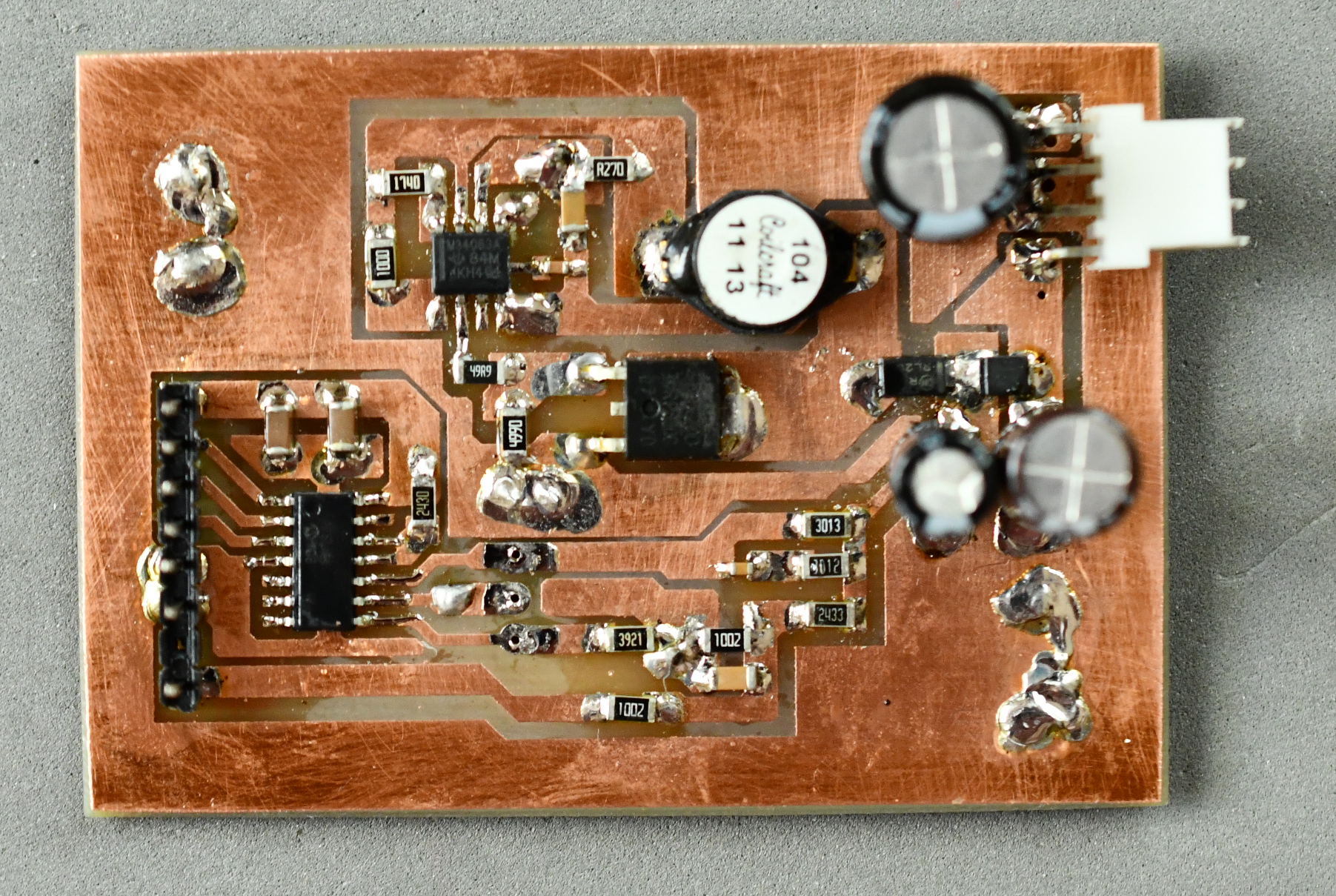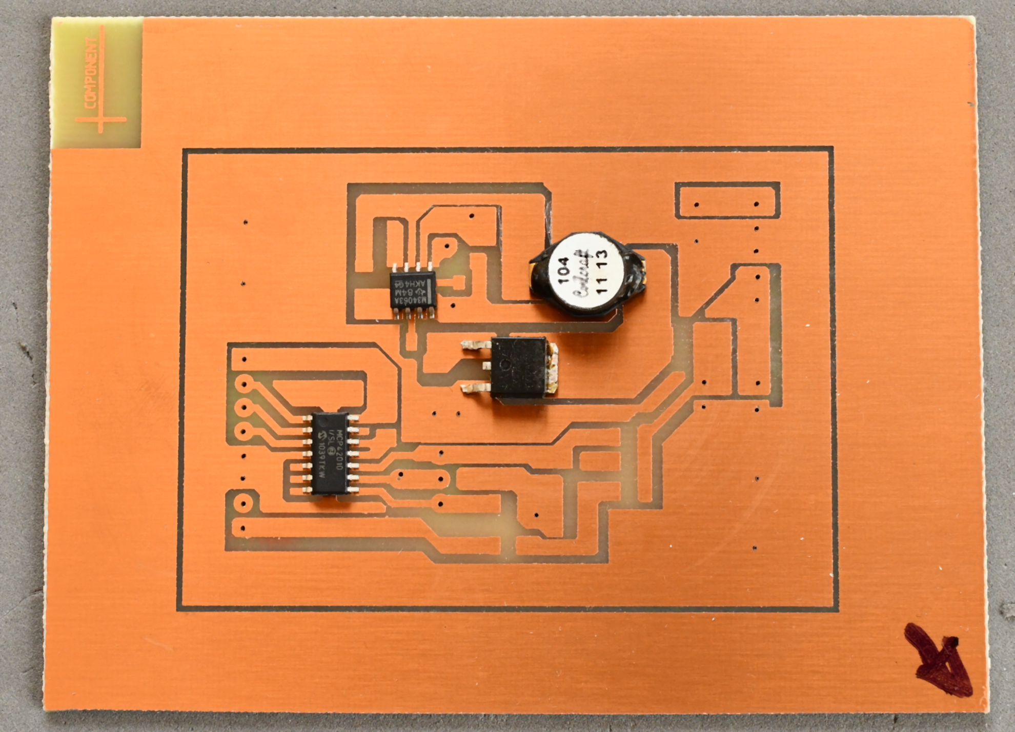 The example layout in Part 2 (Figures 1 -- 3) can be seen in Figure 9. Figure 9 (top) shows the PCB after etching and with vias and through-holes drilled. Some components have been loosely placed, but not soldered. The bottom right arrow was used to explore alignment issues, but none were found. Note how well-defined the letters in the top left corners have been etched. Figure 9 (bottom) shows the same PCB, cut to size and fully populated. As can be seen from the ICs, a 50-mil pin pitch is nowhere near the limits of this fabrication method.