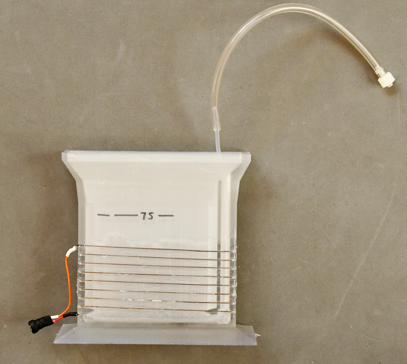 I found it useful to 3D-print cuvettes that fit the PCB size and thus allow etching with the least amount of etching solution. Figure 8 shows a cuvette for 100 x 75 mm PCBs. The cuvette can be filled with 100mL etching solution. Resistance wire repurposed from an old toaster is used for heating (a 19V laptop power supply provides sufficient voltage and has ample current capacity). A Teflon tube runs along the bottom, into which I pierced small holes at regular intervals. A small membrane pump can be attached to provide aeration.