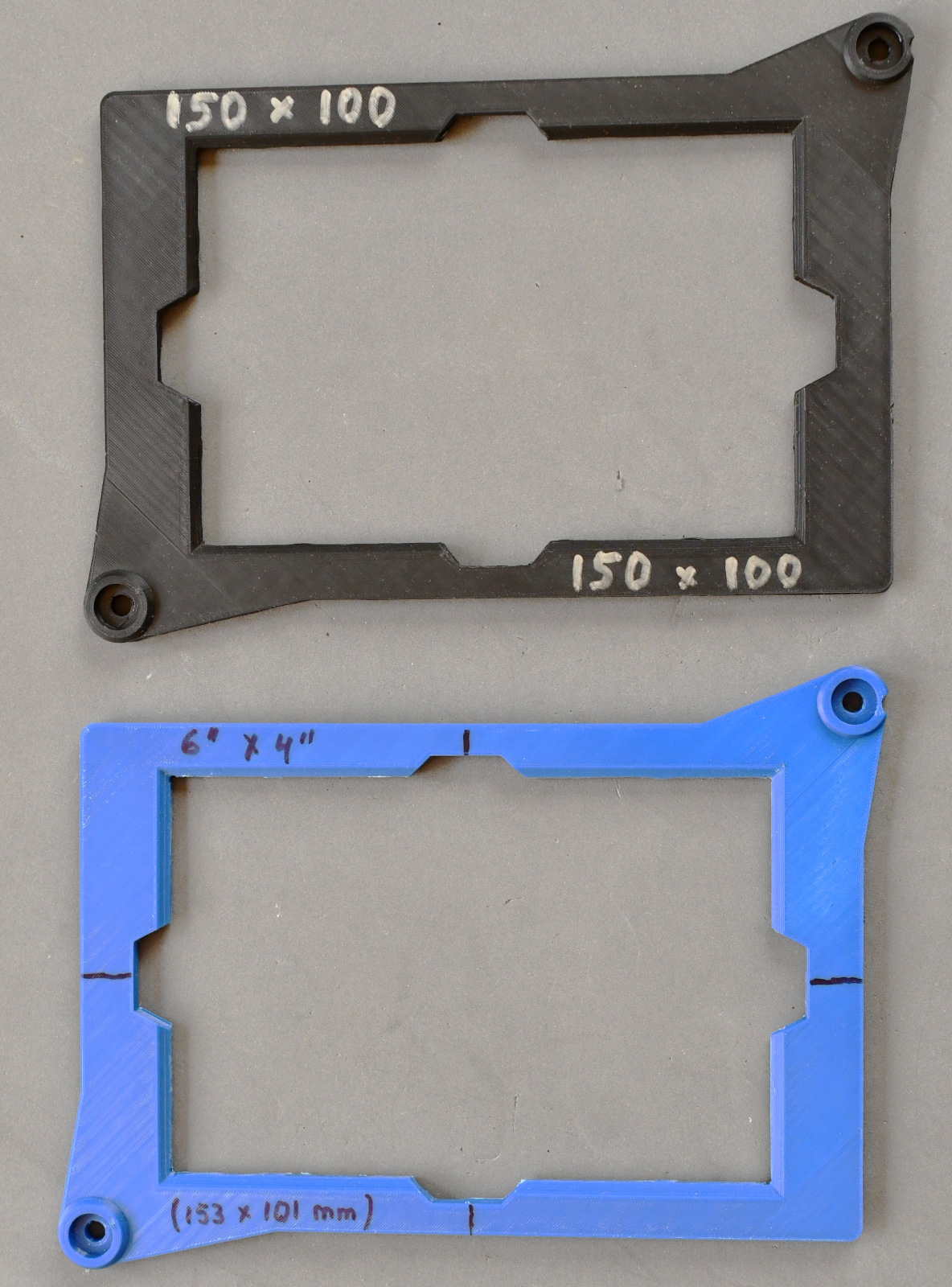 | Figure 5: Frames to hold a PCB centered above the print screen. Mounting holes match those of the resin vat. Click on the image to access a full-size version. |