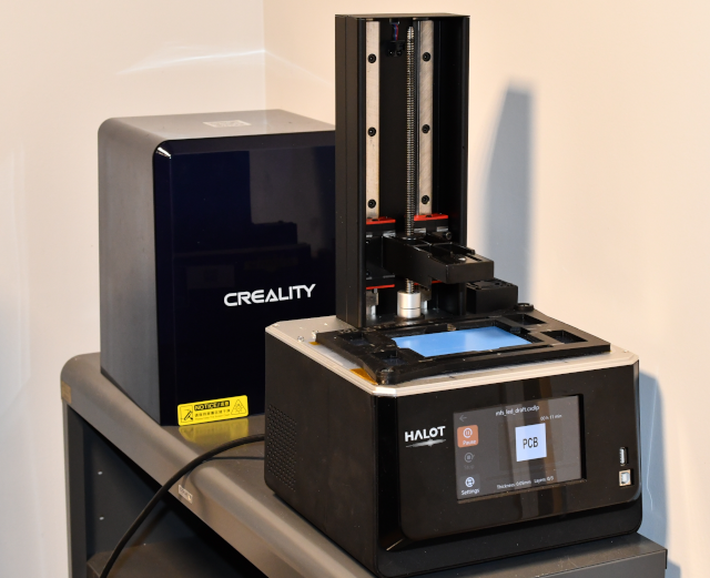 Figure 7 shows the Halot-One resin printer in its modified form -- resin vat and build plate removed, a PCB frame mounted in place of the resin vat with a piece of protective FEP foil underneath frame and PCB. The touchscreen display of the printer displays the "tiny.png" icon with the letters "PCB". The photosensitive PCB is in place with the solder side facing down (blue protective foil removed), and the component side is facing up, the protective foil still in place.