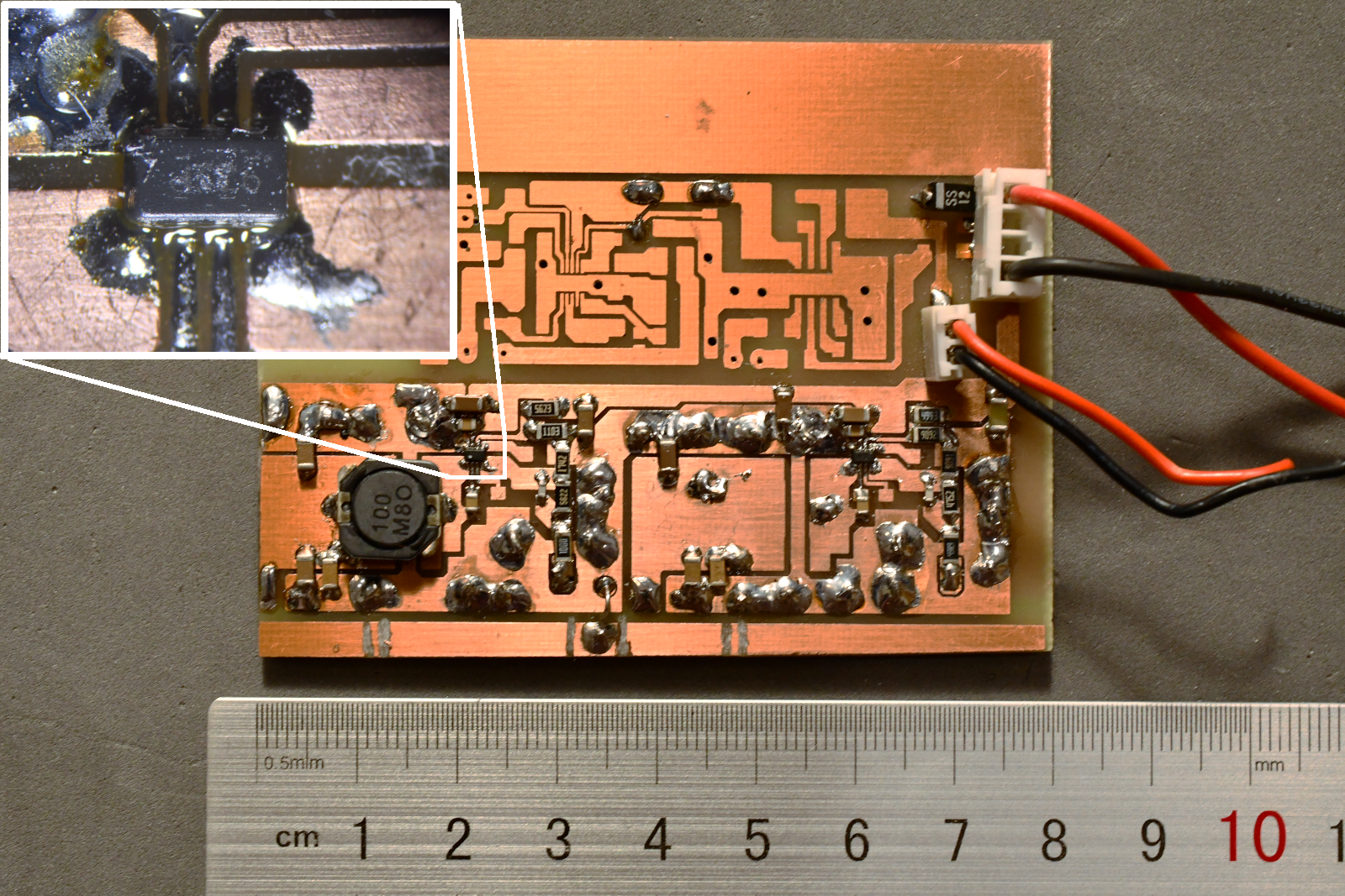 Figure 10 shows a different board; in this case, one IC is present in a SOT-5x3 package with pins less than 0.25 mm in each direction and 0.5 mm pin pitch. The IC is shown under the microscope in the inset. The IC itself is only 2 mm wide by 1.3 mm high. In the not-yet-populated area, a pattern is provided for a 10-pin DFN package (3 x 3 mm) that also has a 0.5 mm pin pitch and 0.25 mm wide pins. the VCC trace (top, pin 8) was not fully separated from the trace to pin 9, and some minor copper residue was removed with a scalpel.