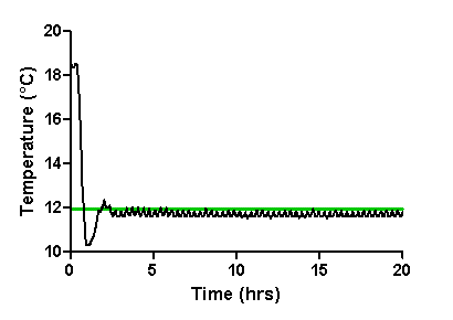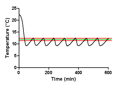 | Figure 2: Cooling behavior of a fridge/freezer with conventional two-point control. the green line is the setpoint, and the red lines represent the lower and upper trip points of the two-point control. The fridge starts equilibrated to room temperature. Strong temperature swings appear as cold air from the freezer compartment diffuses into the fridge compartment. |
