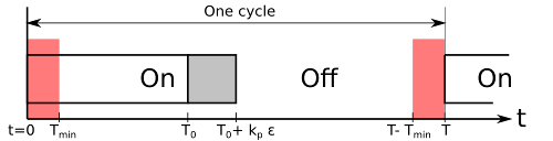 | Figure 1: Diagram of an on-off cycle of duration $T$. At the start of each cycle, the furnace or compressor is turned on and stays on for a duration of $T_0 + k_p \cdot \epsilon$. The red zones are cutoff zones where a cycle is either skipped or continued into the next to reduce startup stress. |