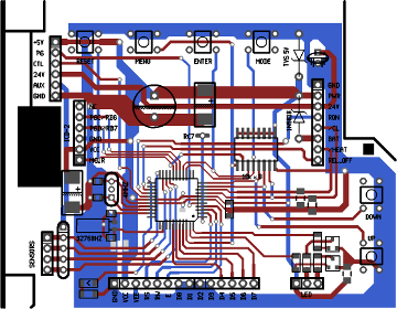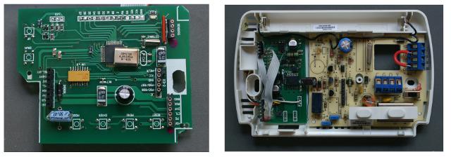 I designed a PCB that has the same physical dimensions as the original White-Rodgers control board. The layout is shown in Figure 7. A side-by-side comparison of the new PCB and the original control board is shown in Figure 8. Note that the new PCB is upside-down and the cutouts therefore mirrored vertically. With the exception of the pushbuttons, the components are facing the base board. Apart from the two buttons for up and down (setpoint adjustment), four more pushbuttons exist: a reset button (emergency stop), a mode button to toggle between day and night modes, and the Menu and Enter keys for parameter adjustment.