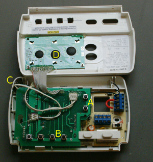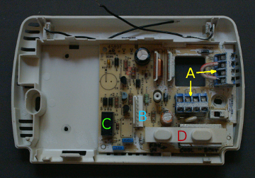 Figure 6 shows the base board inside the lower part of the thermostat case. Above the base board is the battery compartment (with two black wires). Highlighted are the screw terminals for the HVAC wiring (A), the 8-pin connector to the controller (B), the latching relay (C) and the sliders (D). The base board's circuit diagram is shown in Schematic 1. Also visible is some unused space to the left of the base board. This space will be used for the power conditioning subunit.