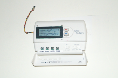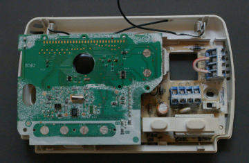 This gets us to the practical realization. When we moved into our home, the painters messed up one thermostat with paint. I used this thermostat for my prototype. This thermostat was a White-Rodgers 80-series non-programmable "dumb" thermostat and conveniently consisted of two circuit boards that I'll denominate "base board" and "control board", respectively. The base board contains the latching relay, the sliders (see Figure 4), some power conditioning and transient suppression, and -- most importantly -- a connector for the control board. The control board performs the actual thermostat function.