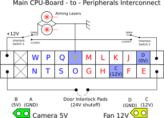 A closer look at the connections between the main control board and other parts of the device is given in Figure 8. The main board connects to a 24-pin connector, from which cables run to various parts of the device. A saparate 2-pin connector provides 5V for the camera and 12V for the fan. The interlock switches are indicated in Figure 8, and the interlocks also control the aiming lasers, turning them on when the door is open. The remaining signals are widely unknown at this time. The wires indicated in red (E-M) connect a 9-pin sub-D connector that is accessible at the back of the device to the header labeled "camera". The wires indicated in blue (N-Q, S, T, V, W) begin on the main board at the header labeled "AEC" (automatic exposure control?) and end in a large connector labeled J3.