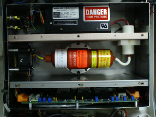 Inside the outer x-ray generator housing, we find a control board (not further examined) and the high-voltage source. The source, including three modules on the control board, are manufactured by Gamma High Voltage Research, Inc. in Ormond Beach, FL. The HV generator is labeled XR15-35P/M530A, where 15-35 probably indicates the voltage range, 15kV to 35kV. A view inside the generator housing is shown in Figure 6.