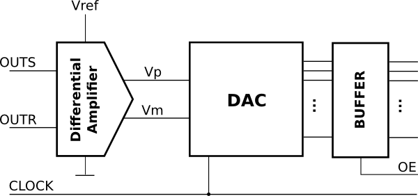 | Figure 9: Block diagram of the analog stage. The differential input signal (OUTS/OUTR) of the RadIcon sensor is amplified by a differential amplifier and fed into the differential inputs of a fast ADC. Sensor module and ADC are clocked synchronously. Since I am crossing PCBs, an output buffer is provided. Gain and offset (Vref) of the difference amplifier should be controllable by digital potentiometers. The output enable signal (OE) allows to prevent the signals from colliding on the bus. |